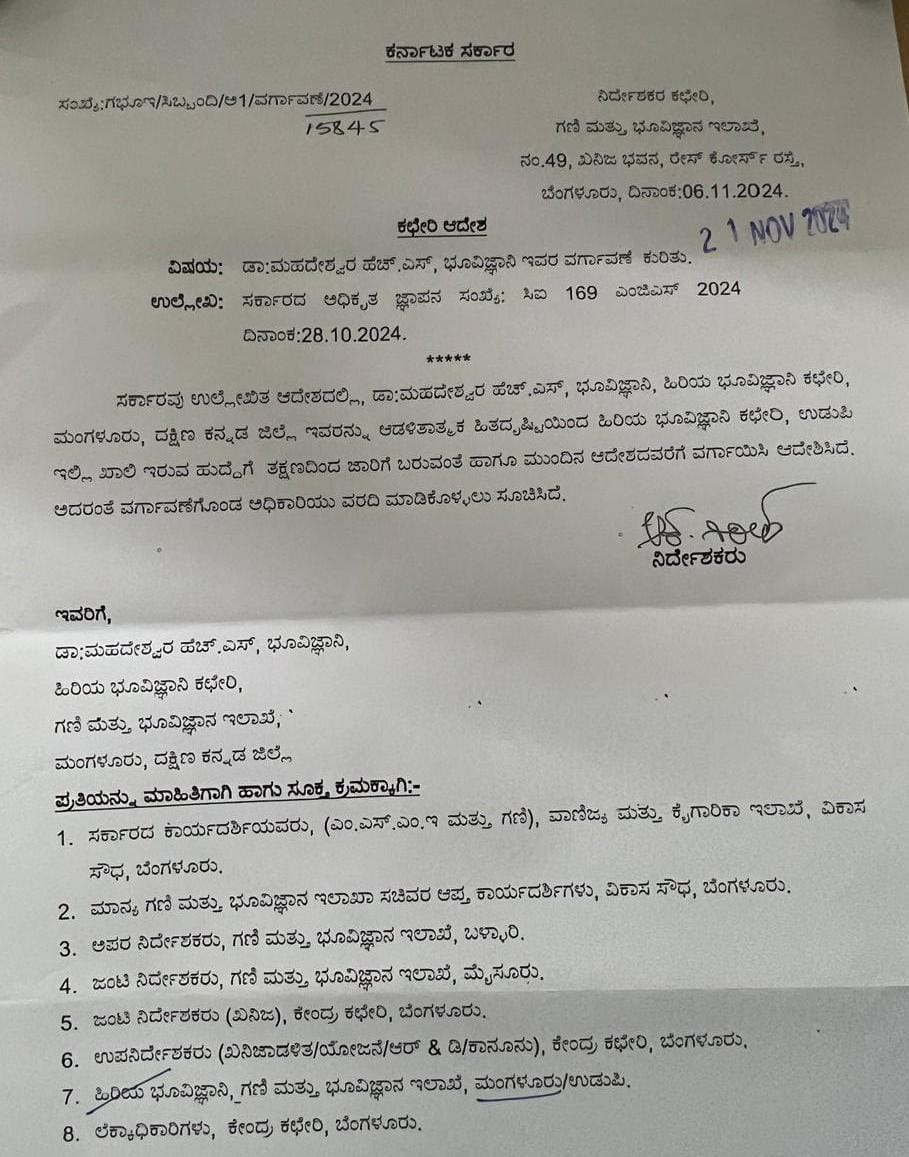 ಇತ್ತೀಚೆಗೆ ಮಂಗಳೂರು ಗಣಿ ಇಲಾಖೆಯ ಹಿರಿಯ ಭೂವಿಜ್ಞಾನಿ ಕೃಷ್ಣವೇಣಿ ಲಂಚದ ಹಗರಣದಿಂದ ಅಮಾನತುಗೊಂಡಿರುವ ವಿಷಯ ಇಡೀ ರಾಜ್ಯದಲ್ಲಿ ಟಾಂ ಟಾಂ ಆಗಿದೆ. ಇವರ ಭ್ರಷ್ಟಾಚಾರಕ್ಕೆ ಬೆಂಬಲವಾಗಿ ನಿಂತಿದ್ದವರು ಭೂವಿಜ್ಞಾನಿ ಡಾ. ಮಹದೇಶ್ವರ ಎಚ್ಎಸ್ ಎಂದು ಕೂಡ ಪ್ರಚಾರ ಆಗಿತ್ತು. ಭೂ ವಿಜ್ಞಾನಿಯಾದ ಮಹಾದೇಶ್ವರ ಎಚ್ ಎಸ್ ದಕ್ಷಿಣ ಕನ್ನಡ ಜಿಲ್ಲೆಯ ಭೂ ಮತ್ತು ಗಣಿ ವಿಜ್ಞಾನ ಇಲಾಖೆಯಲ್ಲಿ ಕೆಲಸ ನಿರ್ವಹಿಸುತ್ತಿದ್ದಾರೆ. ಸನ್ಮಾನ್ಯರು ಸರಿ ಸುಮಾರು ಐದು ವರ್ಷಗಳಿಂದ ದಕ್ಷಿಣ ಕನ್ನಡ ಜಿಲ್ಲೆಯ ಗಣಿ ಇಲಾಖೆಯಲ್ಲಿ ಕೆಲಸ ಮಾಡುತ್ತಾ ಇದ್ದಾರೆ. ಕರ್ನಾಟಕ ಸರಕಾರದ ಸುತ್ತೋಲೆಯ ಪ್ರಕಾರ ಒಂದು ತಾಲೂಕು ಅಧಿಕಾರಿಯಾಗಿ ಇರುವವರು ಎರಡು ವರ್ಷಕ್ಕಿಂತ ಜಾಸ್ತಿ ಒಂದೇ ಕಡೆ ಟೆಂಟ್ ಹಾಕುವಂತೆ ಇಲ್ಲ. ಆದರೂ ಅವರಿವರಿಗೆ ನಮಸ್ಕಾರ ಮಾಡಿ, ಸಾಷ್ಟಾಂಗ ಬಿದ್ದು ವರ್ಗಾವಣೆ ಆಗದೆ ಕನಿಷ್ಠ ಮೂರು ವರ್ಷ ಇರಬಹುದು. ಆದರೆ ಜಿಲ್ಲೆಯಲ್ಲಿ ಭೂ ಮತ್ತು ಗಣಿ ಇಲಾಖೆಯ ಅಧಿಕಾರಿ ಮಹದೇಶ್ವರ ಎಚ್ ಎಸ್ ಸರಿ ಸುಮಾರು ಐದು ವರ್ಷಗಳಿಂದ ಎಲ್ಲಿಗೂ ಗಂಟು ಮೂಟೆ ಕಟ್ಟಿಲ್ಲ. ಈ ಅಧಿಕಾರಿಗೆ ದಿನಾಂಕ 28/10/2024 ರಂದು ವರ್ಗಾವಣೆ ಆದೇಶವಾಗಿತ್ತು. ಆದರೆ ಹಿರಿಯ ಭೂವಿಜ್ಞಾನಿಯಾದ ಕೃಷ್ಣವೇಣಿಯವರು ಸರಕಾರದ ಆದೇಶವನ್ನು ಧಿಕ್ಕರಿಸಿ ಮಾದೇಶ್ವರ ಸಾಮಿಯನ್ನು ರಿಲೀವ್ ಮಾಡಿರಲಿಲ್ಲ. ಯಾಕೆಂದರೆ ತನ್ನ ಬ್ರಷ್ಟಾಚಾರದ ಕೆಲಸಗಳಿಗೆ ಸಹಕಾರ ನೀಡುತ್ತಿದ್ದ ಎಂಬ ಒಂದೇ ಕಾರಣಕ್ಕೆ. ದೊಡ್ಡ ದೊಡ್ಡ ಅಕ್ರಮ ಮಾಫಿಯಾದ ಜನರನ್ನು ಇದೇ ಭೂ ವಿಜ್ಞಾನಿಯಾದ ಮಹದೇಶ್ವರ ಎಚ್ಎಸ್ ಅವರು ಹಿರಿಯ ಭೂವಿಜ್ಞಾನಿಯಾದ ಕೃಷ್ಣವೇಣಿ ಅವರಿಗೆ ಪರಿಚಯ ಮಾಡಿಸುತ್ತಿದ್ದರು ಎಂದು ತಿಳಿದುಬಂದಿದೆ. ಇದು ಸಹ ಭೂ ವಿಜ್ಞಾನಿಯಾದ ಮಹದೇಶ್ವರ ಎಚ್ಎಸ್ ಇವರಿಗೆ ವರ್ಗಾವಣೆ ಆಗದ ರೀತಿಯಲ್ಲಿ ಸಹಕಾರವಾಗಿತ್ತು. ಸರಕಾರ ವರ್ಗಾವಣೆಯನ್ನು ಮಾಡಿದ್ದರೂ ಈ ವರ್ಗಾವಣೆ ಆದೇಶವನ್ನೇ ತನ್ನ ಹಿಡಿತದಲ್ಲಿ ಹಿಡ್ಕೊಂಡು ಸರಕಾರಕ್ಕೇ ಸವಾಲು ಎಸೆದಂತಹ ಲಂಚದ ಅಧಿಕಾರಿ ಕೃಷ್ಣವೇಣಿಯವರ ಒಂದು ಆಟ ನಿಂತಿತು. ಆದರೆ ಕಳೆದ ವರ್ಷ ವರ್ಗಾವಣೆಯಾದಂತಹ ಭೂವಿಜ್ಞಾನಿ ಮಹದೇಶ್ವರ ಎಚ್ಎಸ್ ಯಾವಾಗ ವರ್ಗಾವಣೆ ಆಗುತ್ತಾರೆ ಎಂಬುದು ಇನ್ನೂ ನಿಘಂಟಾಗಿಲ್ಲ. ಸರಕಾರ ತಕ್ಷಣ ಈ ವರ್ಗಾವಣೆ ಆದೇಶವನ್ನು ಮತ್ತೇ ಜ್ಯಾರಿ ಮಾಡಿ ಕೃಷ್ಣವೇಣಿ ಮತ್ತು ಭೂ ವಿಜ್ಞಾನಿಯಾದ ಮಾದೇಶ್ವರ ಎಚ್ಎಸ್ ಇವರನ್ನು ಕರಾವಳಿಯಿಂದಲೇ ಶಿಫ್ಟ್ ಮಾಡಿ, ಅವರ ಮೇಲೆ ಕಾನೂನು ಕ್ರಮ ಕೈಗೊಳ್ಳಬೇಕಾಗಿ ದಕ್ಷಿಣ ಕನ್ನಡ ಜಿಲ್ಲೆಯ ಜನರು ವಿನಂತಿಸಿಕೊಳ್ಳುತ್ತಿದ್ದಾರೆ ಮತ್ತು ದಕ್ಷಿಣ ಕನ್ನಡ ಜಿಲ್ಲೆಯಲ್ಲಿ ಇವರಿಂದ ಸಂತ್ರಸ್ಥರಾದವರಿಗೆ ಒಂದು ನ್ಯಾಯ ಒದಗಿಸಿ ಕೊಡಬೇಕಾಗಿ ಸಾರ್ವಜನಿಕ ವಿನಂತಿ.